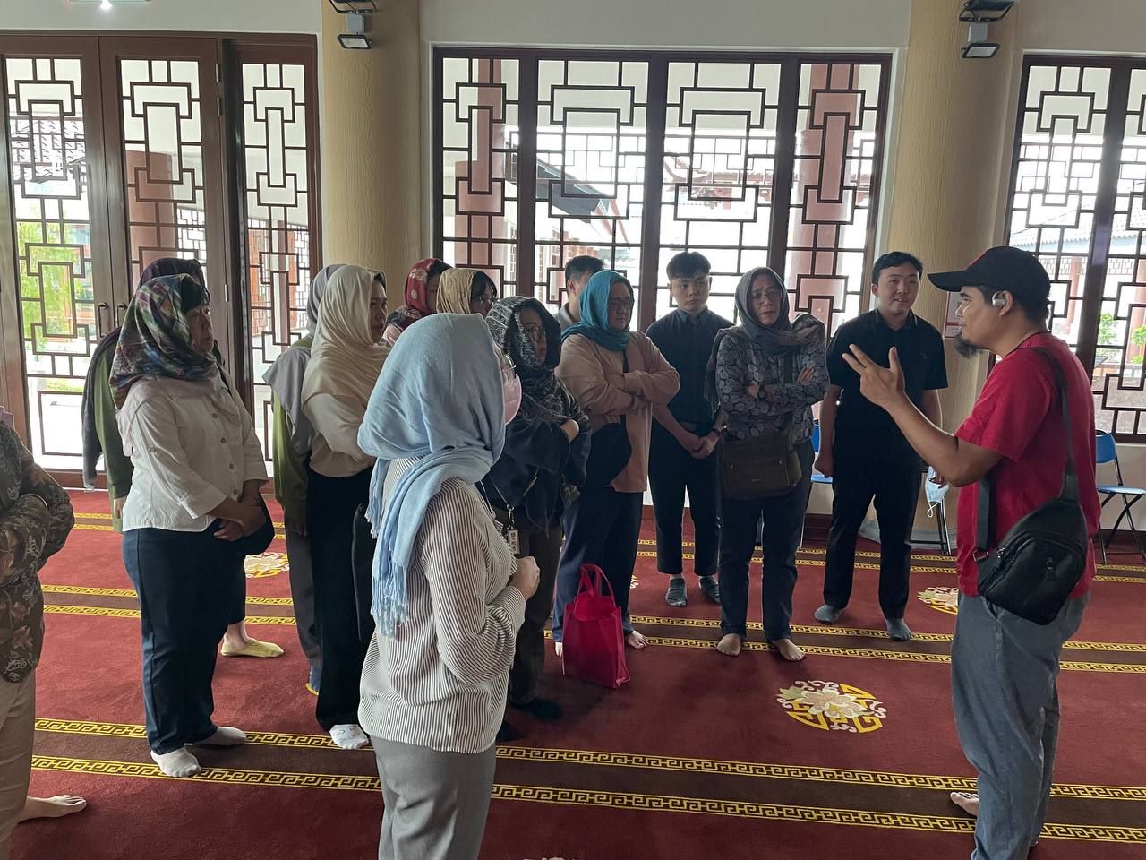 抵达大门,按照负责人提醒,我们脱鞋放好,整饰衣装才进入华穆寺,开始展开整个参观行程。华文组和国文组的导览员都是马来同胞,他们都能说得一口流利的华语,因为有马来老师,所以我们是兵分两路进行参观。讲解过程让我们感受到他们的热情接待,非常有耐心地解说整个清真寺的构造和回教发展史,甚至提到回教在这个世界宗教领域上所属的崇高地位。