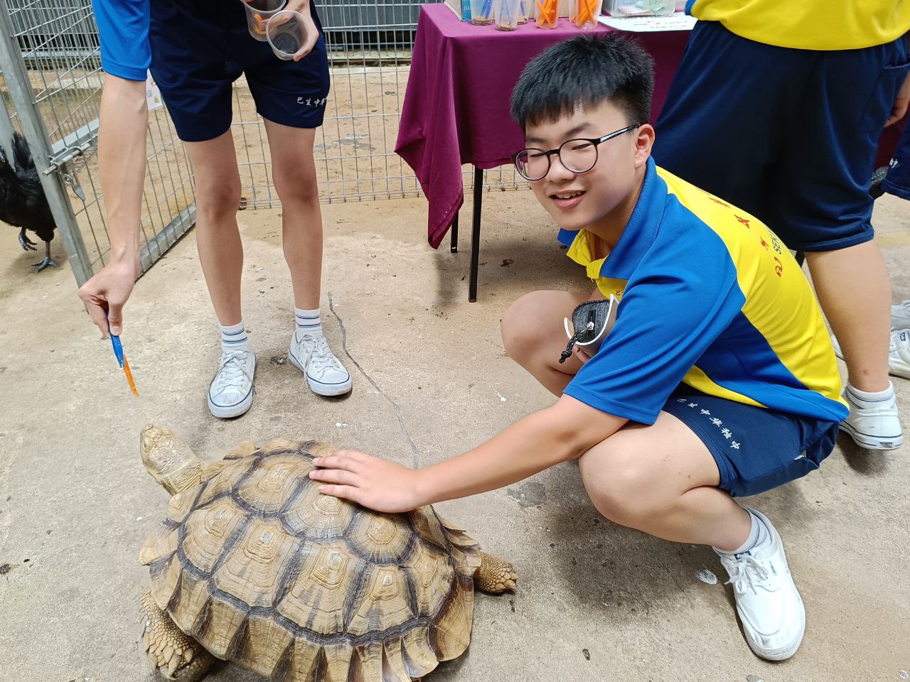 之后,我们就看到了很多节肢动物和藻类,最让我感到新奇的是看到了许多只有 1cm 的虾,因为我不曾看过这么小只的虾。此外,我们还看到了许多鱼类,例如一只很漂亮的亚洲龙鱼、在我们校园的鱼池里,也有的高头、大丝足鲈。在往院子深处走,我们看到了,一个体型庞大的苏卡达象龟。