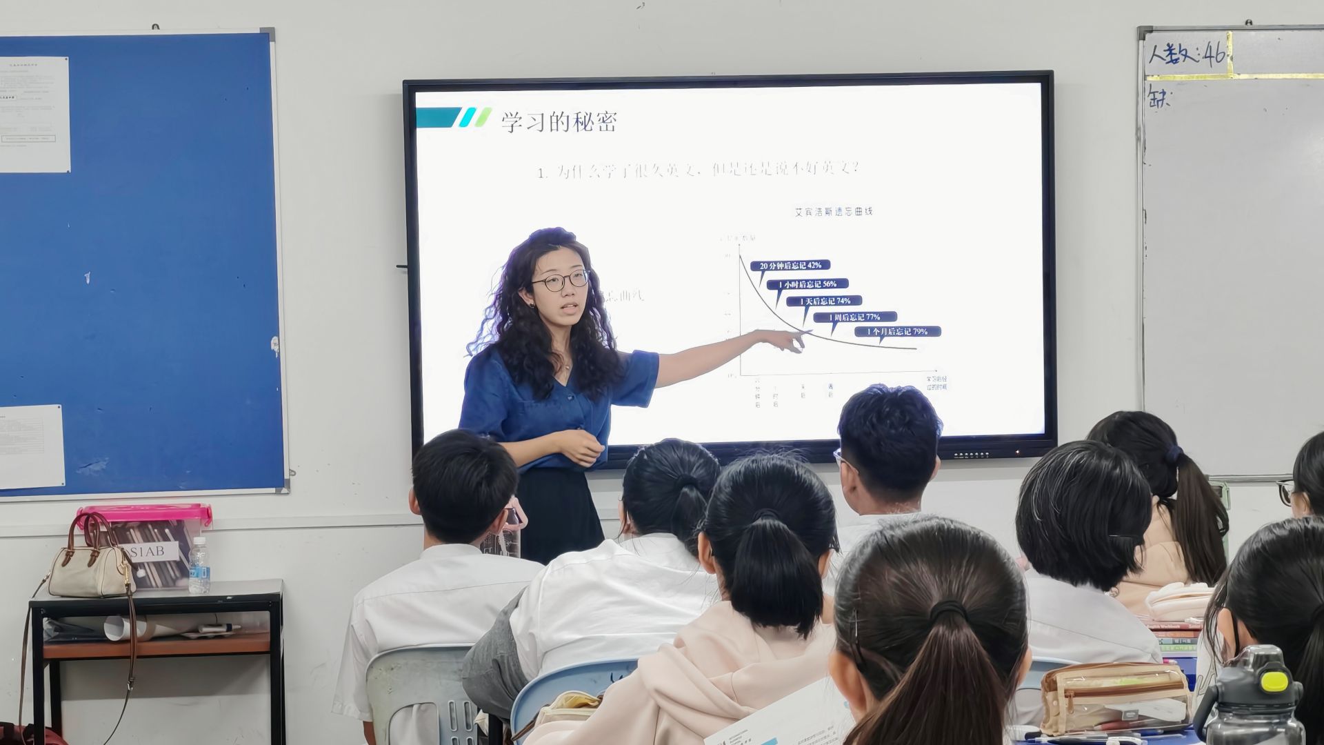王老师首先探讨了英语学习的常见困惑,指出许多同学学了多年英语,却依然无法流畅表达。她引用艾宾浩斯遗忘曲线和一万小时定律,强调英语学习需要长期积累和刻意练习。同时,她鼓励同学们通过“读书、行路、学徒、实践”四种方式实现终身学习。她还特别提到,提升英语表达能力的关键在于大量语言输入,尤其是增加词汇量,这样才能真正实现有效输出。