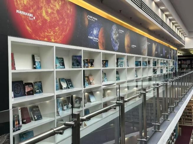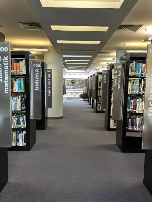 除了基本空间参观,我们也有特别去了解该图书馆的藏书分类方法。图书馆内使用的图书分类系统与馆藏管理方式井然有序,排列分门别类且结构严谨。馆内的藏书大多以马来文和英文书籍为主,其中四楼的参考资料区也有大量的参考书供借阅。此外,馆内各个楼层都有设计了不同的主题并摆放了相关主题的书籍,也展示了其过去举办的阅读推广活动,参观过后对会员们日后在校内协助图书管理工作具有极大的参考价值。