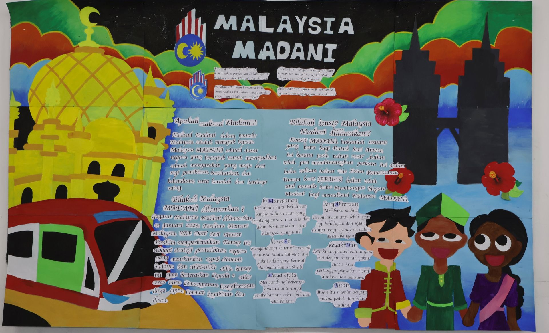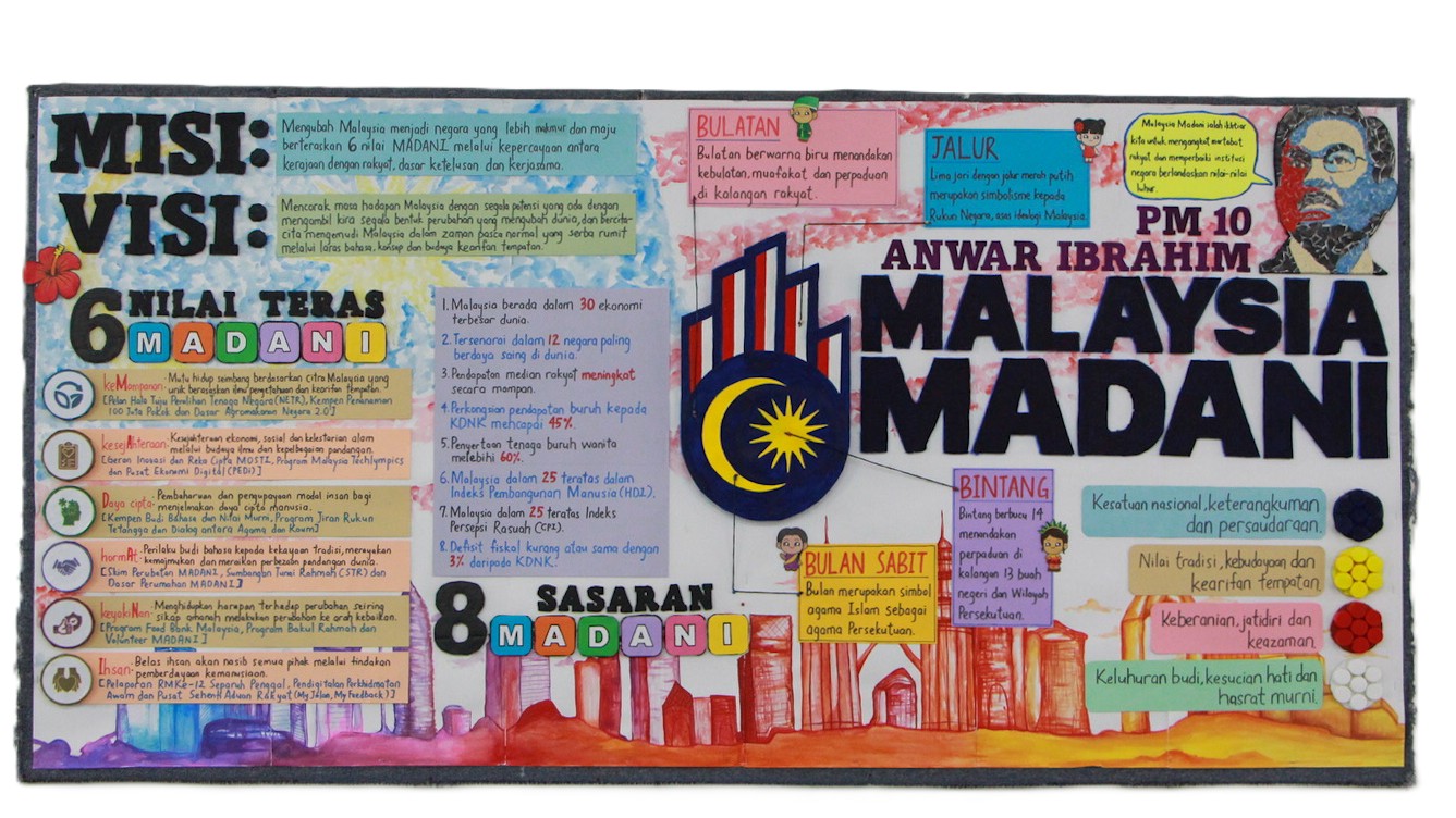训导处在此次壁报比赛与我校国文组一同合作。全校各班级积极参与,无论是主题构思、资料搜集、文案撰写到美术设计,各班都展现出高度的投入与团队精神。壁报内容不仅涵盖 Malaysia Madani 六大核心价值——可持续性、繁荣、创新、尊严、尊重与信任,还融入了学生对国家未来发展的想象与祝愿。