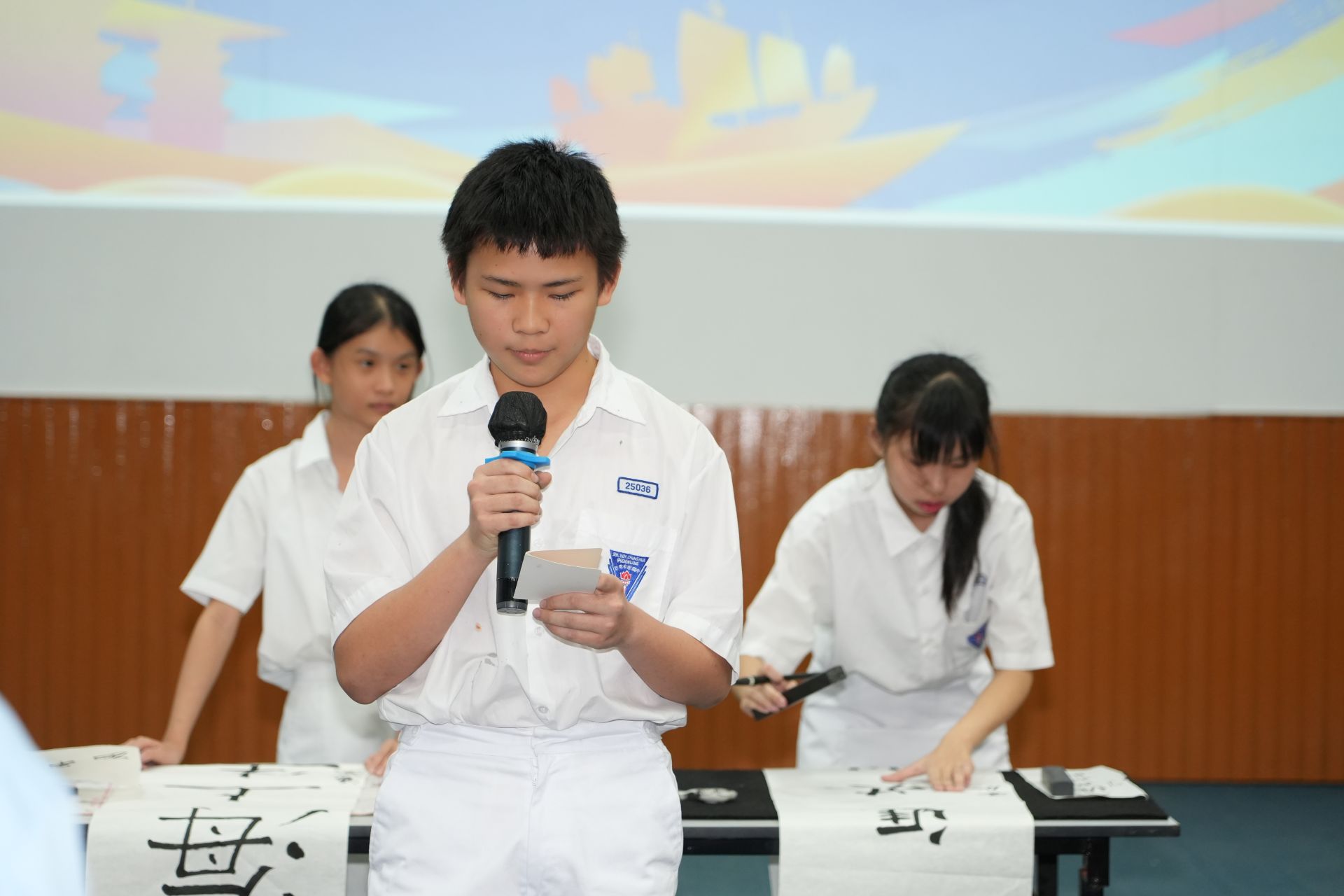 根据课程安排,四天的学习内容紧凑而多样。活动首日以“中华礼仪与语言”讲座揭开序幕,紧接着同学们走进“簪花文化”的课堂,亲手体验泉州非遗簪花技艺。第二天与第三天,则聚焦于书法与诵读。同学们在欧阳军老师的指导下,专注练习硬笔与毛笔书法,领略汉字的独特魅力;同时在张虹老师、郭泽青老师与郑亚芳老师的带领下,学习朗诵技巧与经典篇目的欣赏,感受文字的情感力量。最后一天的“我的快乐分享”口语实践课,为学生提供了展现自我的舞台。活动以结业式画下圆满句点,同学们以诗词朗诵、书法展示与合唱《茉莉花》呈现学习成果,赢得满堂掌声。